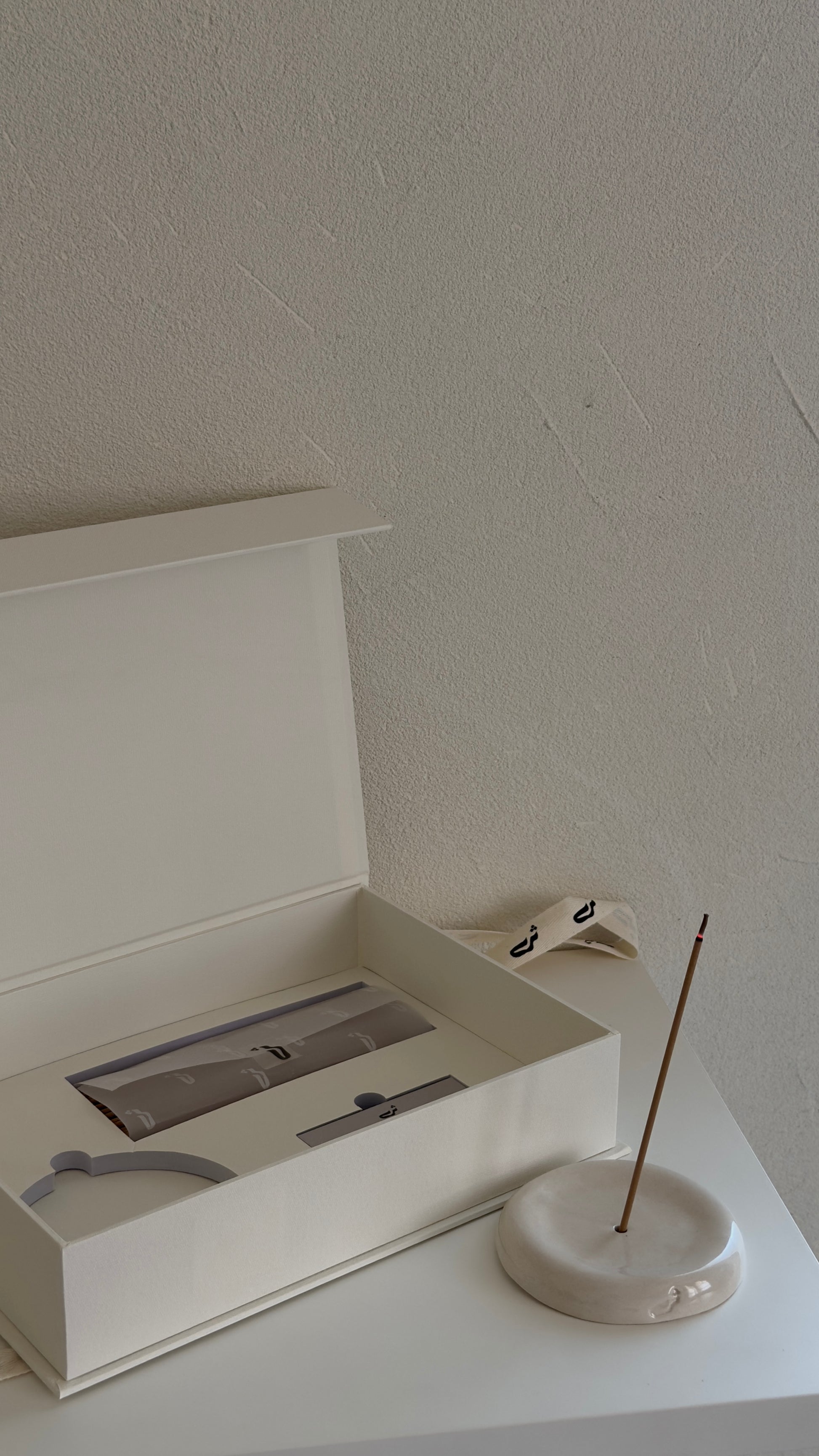قاعده العود باللون الابيض و 25 من أعواد العود الكمبودي و كبريت تأتي بتصميم أنيق في عبوة فاخرة، مما يجعلها هدية مثالية لمحبي الروائح الشرقية.